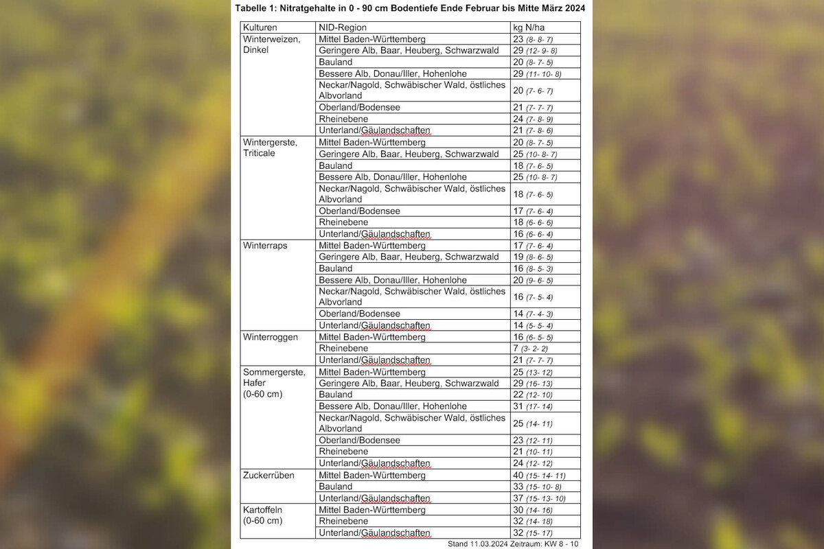 Ab dem 15. März können auch Mais und Reben über den NID beprobt werden. Im Artikel kommende Woche ist mit den ersten Ergebnissen zu rechnen. Der landesweite Mittelwert von circa 4100 beprobten Ackerbau-Standorten beträgt für den Nitratgehalt derzeit 24 kg N je ha.