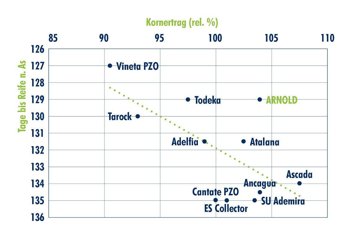 Mehrjährige Landessortenversuche bestätigen die Leistungsfähigkeit in unterschiedlichen Anbauregionen – auch bei wechselnden Witterungsbedingungen. Damit bietet ARNOLD ein ausgewogenes Gesamtpaket für Betriebe, die früh ernten möchten und gleichzeitig auf Ertrag, Qualität und Planungssicherheit setzen.