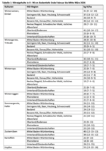 Durch die gestiegenen Temperaturen und die trockenere Witterung gehen diese Woche mit rund 4300 beprobten und ackerbaulich genutzten Standorten deutlich mehr Proben ein als in den Auswertungen der letzten Wochen. Der landesweite Mittelwert für den Nitrat-N-Gehalt beträgt derzeit 29 kg N je ha und liegt damit lediglich 2 kg N je ha höher als in der Vorwoche. Bei Betrachtung der Winterungen, die weiterhin mehr als 70 Prozent der beprobten Standorte ausmachen, liegt der Mittelwert bis 90 cm bei 29 kg N je ha und damit auf dem Niveau der Vorwoche. Die Verteilung über die einzelnen Schichten ist hier 9 - 11 - 9 kg je ha. Nitratgehalte der Sommerungen Unter den geplanten Sommerungen ohne Mais wurde ein Nitratgehalt von 24 kg N je ha in einer...