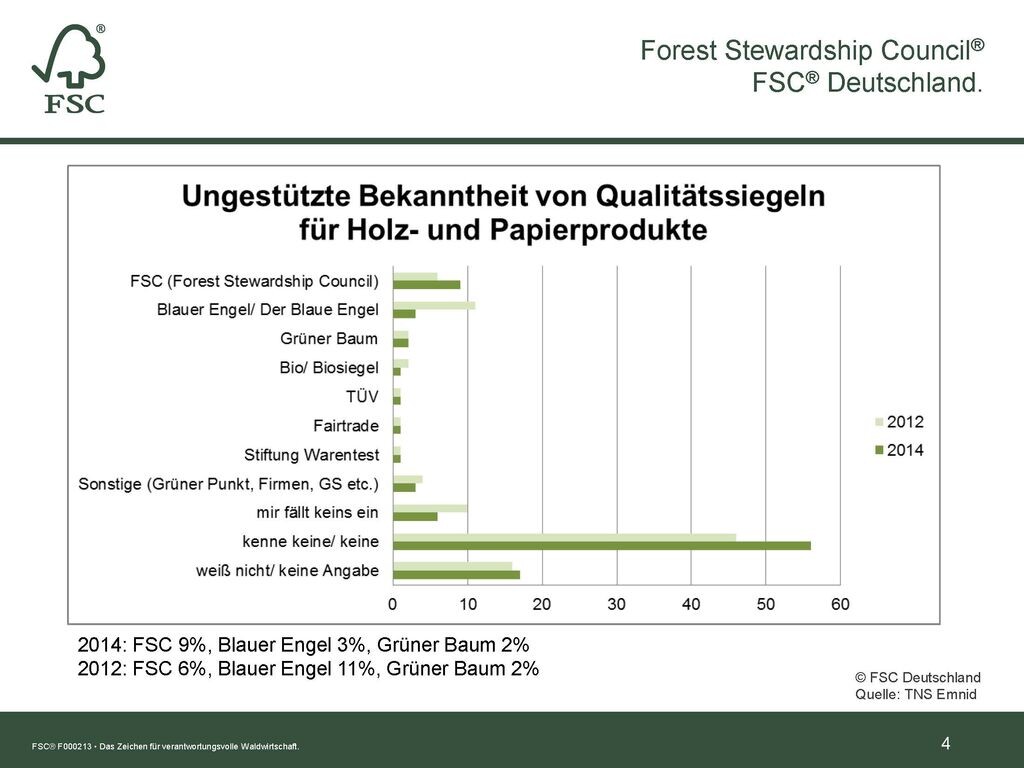 Im Vergleich zu den aktuellen Zahlen, gaben bei der letzten Umfrage 2012 noch 33 Prozent der Befragten an, das FSC-Logo zumindest vom Sehen zu kennen. Dieser Zuwachs von 17 Prozent in der gestützten Bekanntheit stellt für den FSC einen wichtigen Quantensprung dar. Das Ergebnis unterstreicht die starke Position des FSC-Zertifikats in der Gesellschaft als unabhängiges Siegel für Holz- und Papierprodukte.