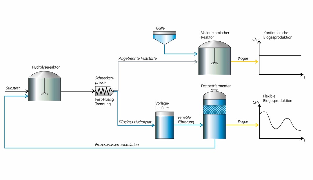 In dem neuen System wird die Biogasproduktion nun auf drei Fermenter verteilt. Im ersten wird die zugeführte Organik durch Hydrolyse für die an den nachfolgenden Prozessschritten beteiligten Mikroorganismen leichter zugänglich gemacht, verbleibt dort aber nur wenige Tage. Danach erfolgt eine Trennung in festes und flüssiges Material. Das feste Material kommt in einen konventionellen Fermenter und wird dort kontinuierlich zu Biogas vergoren. Das flüssige Material wird in einem Pufferspeicher zwischengespeichert, bis es zur gezielten Gasproduktion einem Hochleistungs-Fermenter zugeführt wird. Dort kann es innerhalb von Stunden zu Biogas umgesetzt werden. Dabei können rund zwei Drittel durch die flexible Vergärung der Flüssigphase bereit gestellt werden. Das neue Anlagenkonzept bietet zudem den Vorteil, dass nun auch schwerer abbaubare Substrate wie ligninhaltiges Stroh und - aufgrund der kurzen Verweilzeiten im ersten Prozessschritt - auch schnell wechselnde Substrattypen verarbeitet werden können. Dies bietet die Möglichkeit, das Substratspektrum für die Biogasproduktion zu erhöhen.