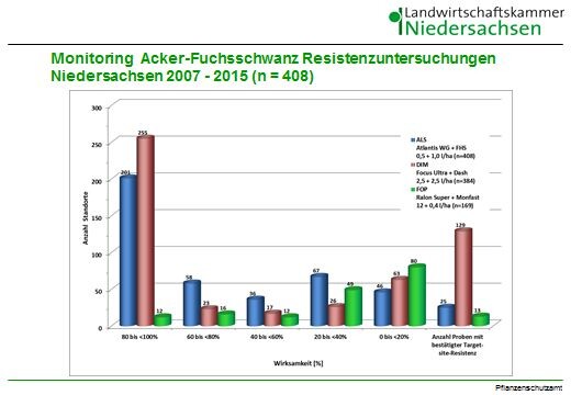 Das Ergebnis ist sehr erschreckend: Ein Drittel der untersuchten Proben zeigt in Niedersachsen keine ausreichende Wirkung mehr für die Wirkstoffgruppe der DIM (z.B. Select 240 EC und Focus Ultra). Die Gruppe der FOP (dazu gehören Herbizide wie z.B. Ralon, Ralon Super, Topik 100) zeigt im niedersächsischen Resistenzmonitoring, dass nur ca. 7 % der Proben eine sensitive Wirkung haben. Eine ausreichende Bekämpfung von Ackerfuchsschwanz ist mit dieser Wirkstoffgruppe demnach alleine weder auf den Marschböden noch auf den typischen Ackerfuchsschwanzstandorten im Binnenland möglich. Auf mehr als 400 Standorte mit Ackerfuchsschwanz wurde eine ALS-Resistenz untersucht und in mehr als 50 % der Proben bestätigt. Besonders die Fälle mit absoluter Target-site Resistenz (TSR) nehmen zu, mittlerweile sind hier 25 Ackerfuchsschwanzstandorte betroffen. Anders ausgedrückt: von den insgesamt 200 gegenüber ALS-Hemmer als resistent befundenen Ackerfuchsschwanzstandorten, sind 12 % nicht mehr mit ALS-Hemmern wirksam bekämpfbar.