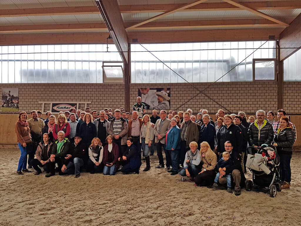 Die über 70 Teilnehmer des Pferdepraxistages wurden von Joachim Jung, Seniorchef des Betriebes, über die Anlage geführt. Vom Vielseitigkeitsgelände mit über 100 Hindernissen, Hügeln und Wasserkomplexen über die jüngst errichtete moderne Führanlage sowie die Stallungen, Reithalle und den Springplatz bekamen die Teilnehmer einmalige Einblicke in das Innenleben eines professionellen und bodenständigen Familienbetriebs.