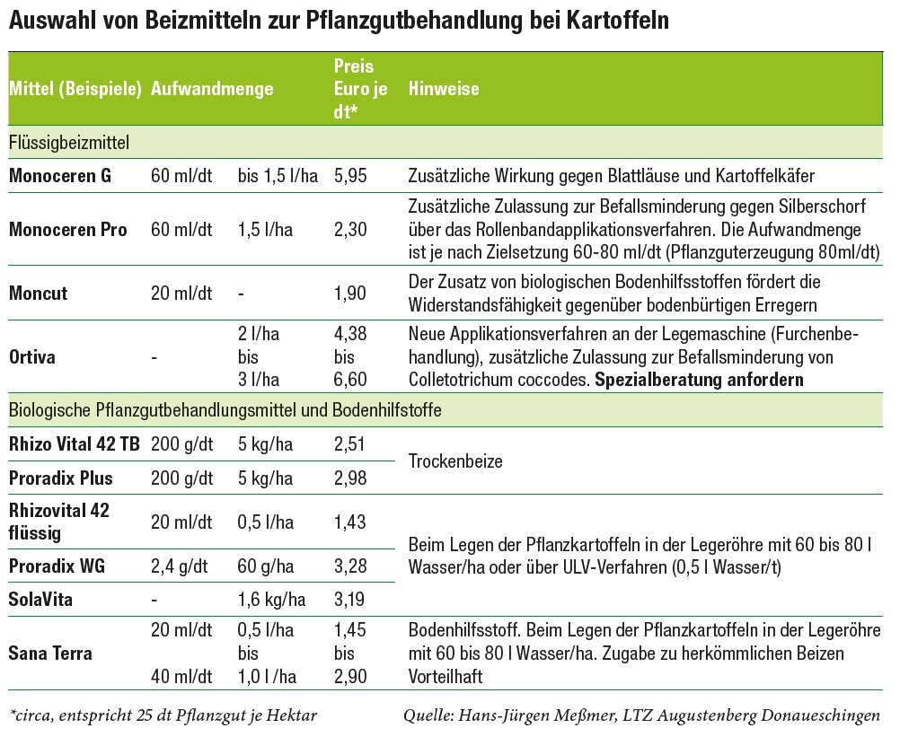 Im Kartoffelanbau gibt es drei Beizverfahren. Die Beizen beim Legen an der Legemaschine ist in Baden-Württemberg das am weitesten verbreitete Beizverfahren, jedoch schützt nur eine Furchenbeize das Knollennest komplett.