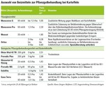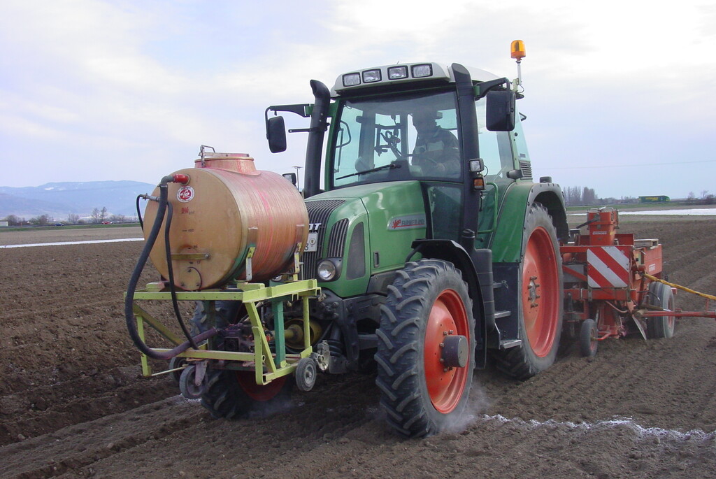 Bei einer dritten Technik sprühen Düsen das Beizmittel dagegen auf die Erde um die Pflanzknolle herum. Nur diese Furchenbehandlung sichert das ganze Knollennest gegen Schaderreger aus dem Boden ab. Sie ist deswegen das wirksamste Verfahren.