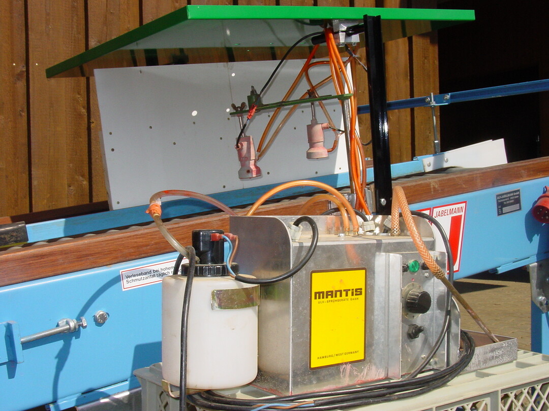 Hier bietet sich die Ultra Low Volume-Technik (ULV, Bild 2) mit Mantis- oder Mafex-Geräten an. Bei dieser Technik gelangt Beizbrühe auf Knollen, die über ein Rollband oder einen Enterder laufen. Eine Rotationsdüse sprüht das Beizmittel ohne oder mit wenig Wasser in feinsten Tröpfchen auf die Knollen.