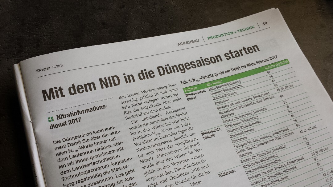 Jede Woche stellen wir Ihnen die aktuellen Daten aus den Messungen des Nitratinformationsdienstes (NID) auf unserer Webseite zum Herunterladen zur Verfügung. Die Beiträge sind als pdf jeweils für ein Jahr zusammengefasst. Neben den aktuellen Werten finden Sie dort auch die Ergebnisse aus den vergangenen Jahren.