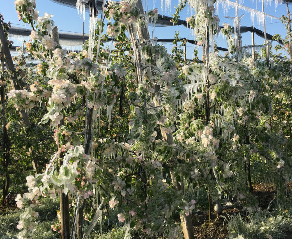 Das Extremfrostereignis mit Temperaturen von bis zu minus sechs Grad führt in allen Anbauregionen des Landes zu massiven Schäden. Die Apfelbäume wurden in der Vollblüte und damit in der empfindlichsten Phase getroffen. Noch schlimmer sieht es im Steinobst aus. Die Kirschenernte wird nahezu komplett ausfallen, denn selbst ein Anbau unter Foliendach bot den kleinen Früchten keinen ausreichenden Schutz.