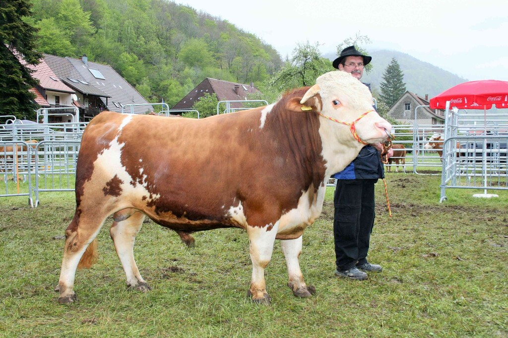 Walben, ein weiterer Fällersohn schloss den Reigen, 6 in der Bemuskelung und 5 in der äußeren Erscheinung waren seine Noten. Daniel Gutmann aus Wieden stellte ihn vor, Arnold Schelb aus dem Münstertal hat ihn gezüchtet. Drei Bullen erhielten die Bemuskelungsnote 8 und einer 7 und belegen den rassetypisch guten Fleischansatz.