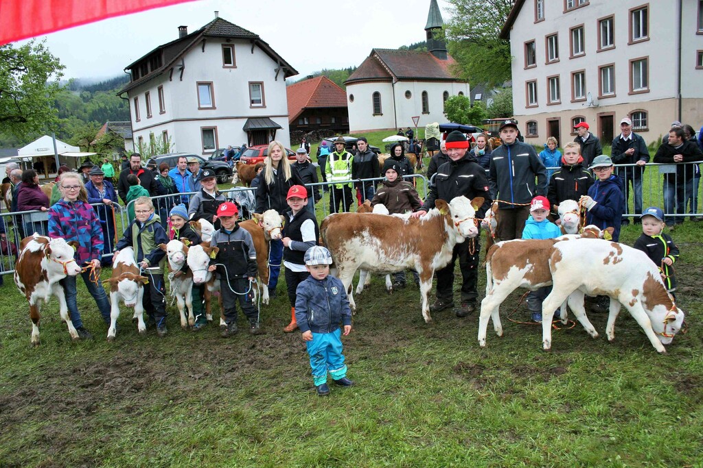 Nach dem Mittagessen – natürlich mit Fleisch vom Hinterwälderrind auch am Samstag – zeigten 14 Jungzüchterkinder ihr Können im Umgang mit einem von ihnen vorgestellten Kalb. Der Applaus der zahlreichen Zuschauer war ihnen sicher. Den Abschluss und Höhepunkt der Schau bildete die Aufstellung und Besprechung der Mutterkuhsieger und der Siegertiere vom Vortag mit der Übergabe der Hauptehrenpreise. Es gelang die Kunst, dass der dringend notwendige Regen genügend Raum ließ, dass man von einer rundherum gelungenen Schau sprechen kann.