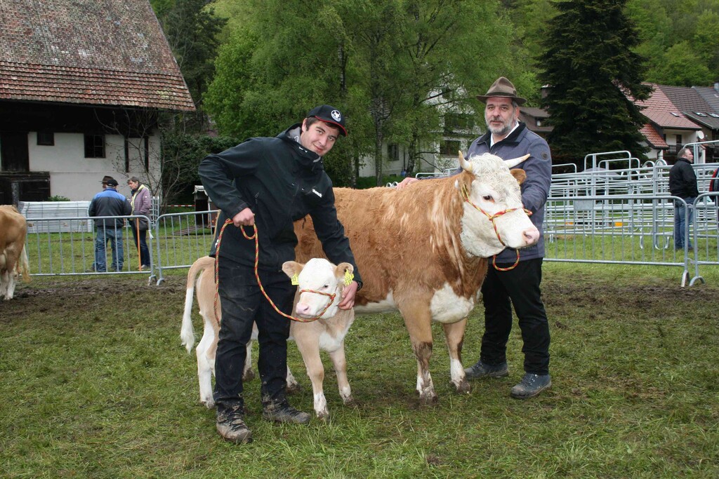 Zweitplatziert war das Gespann Gini und ihr Silharnibullenkalb, das Anton Kalt aus Albbruck- Birkingen präsentierte. Mit 75 Tagen wog es 123 kg, was sehr guten täglichen Zunahmen von 1.333 g entspricht. Auch dieses Kalb erhielt die Note 8 in der Bemuskelung. Es gab aber auch einmal die Note 9 für ein Malakbullenkalb, das mit 103 Tagen 181,5 kg wog und dabei die höchsten Zunahmen von 1.519 g erzielte. Mit seiner Mutter und Humfälbtochter Gerda aus der Zucht von Armin Roser aus Müllheim-Muggardt rangierten sie auf dem zweiten Platz hinter dem Reservesiegergespann.
