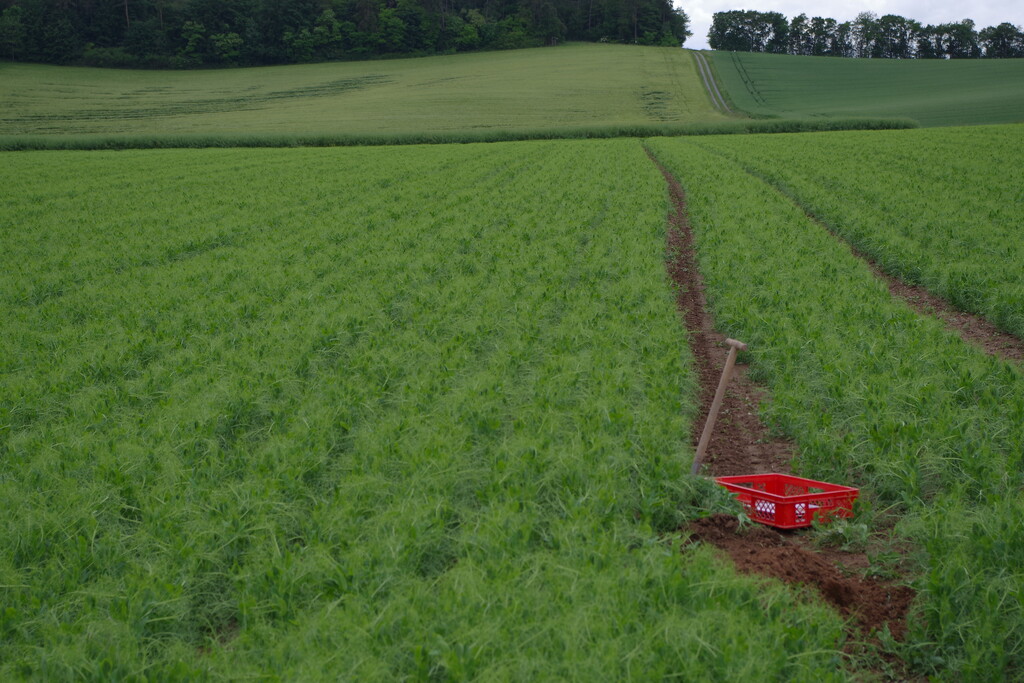 "Wir gehen davon aus, dass Erbsen rund 70 Kilogramm Stickstoff pro Hektar in den Boden bringen", sagt Hartmut Lindner vom Landwirtschaftsamt Main-Tauber-Kreis. Zudem zählen die Körnerleguminosen zum Greeningund weiten die Fruchtfolge. Landwirt Schwab gräbt mit dem Spaten eine Erbsenpflanze aus und zeigt sie mitsamt einem faustgroßen Erdklumpen an den Wurzeln den Besuchern des Feldtags: Viele Wurzeln durchziehen den Boden, dazwischen sind Wurzelknöllchen und Regenwurmgänge erkennbar. "Erbsen hinterlassen einen feinkrümeligen Boden", kommentiert Schwab den Vorfruchtwert der Kultur. Zudem sind Erbsen eine regionale Eiweißquelle und machen von Importen von Futtermitteln unabhängiger.