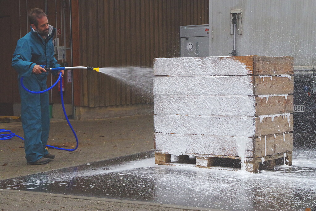 Ein größerer Kostenpunkt ist nach Aussage des Fachmanns aber die Kisten-Logistik am Tag der Reinigung. Drei geschulte Gabelstaplerfahrer schaffen 120 Kisten pro Stunde. Die ließen sich noch komfortabel reinigen. Der Reiniger schaffe mit dem Schaumreiniger (siehe Bild) bis zu 180 Kisten pro Stunde. "So viele kann aber niemand an- und abfahren", erklärt Demmelmaier. Werden die Kisten von Hand herbeigeschafft, liegt das Limit nach der Erfahrung von Demmelmaier bei nur zwölf Kisten je Stunde. Vorsicht beim Reinigen: Der Beton kann durch das Desinfektionsmittel rutschig werden.