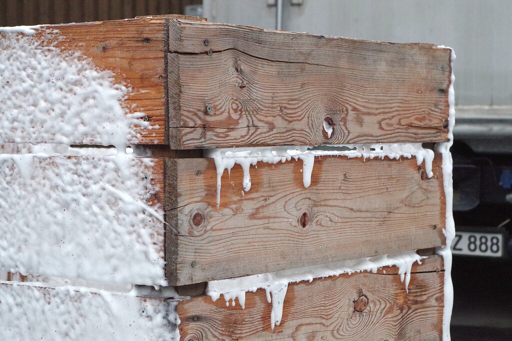 Die Verweildauer eines Desinfektionsmittels spielt besonders auf ungleichmäßigen Oberflächen eine Rolle. Hier: Kartoffelkisten aus Holz. Der Schaum bleibt in Ritzen und Rillen haften. "Gegenüber einer Flüssigkeit bleibt mit Schaum sechsmal mehr Wirkstoff auf der Fläche", kommentiert Demmelmaier eigene Versuche.