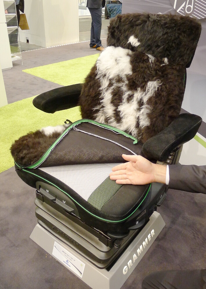 Ebenfalls neu bei Grammer ist ein Konzept für austauschbare Sitzbezüge, die mittels eines Reißverschlusses am Sitz befestigt werden. Ein Teil des Reißverschlusses ist in den Original-Sitzbezug integriert und verläuft entlang der Kedernaht. In diesen Reißverschluss kann ein zusätzlicher Sitzbezug einfach und schnell eingezippt werden. Das Konzept sieht unter anderem Sommer- und Winterbezüge, Lederbezüge oder auch ausgefallenere Designs zur individuellen Gestaltung des Fahrersitzes vor. Der Reißverschluss ist mit seiner Farbgebung und Konturführung bewusst als Designelement gestaltet. Die austauschbaren Sitzbezüge sind, abhängig vom Material, auch waschbar und erleichtern es Landwirten so, den Fahrersitz auf einfache Weise sauber zu halten. Neben dem Schutz des Originalbezugs vor Verschmutzung bieten die austauschbaren Bezüge eine Vielzahl von Individualisierungsmöglichkeiten am Fahrerarbeitsplatz. Auch bei der Nutzung des Fahrzeugs durch unterschiedliche Fahrer — z.B. in Lohnunternehmen — bieten die Sitzbezüge Vorteile: Sie können auf unkomplizierte Weise getauscht werden und tragen so zu mehr Komfort und Wohlbefinden für den einzelnen Fahrer bei, heißt es bei Grammer.