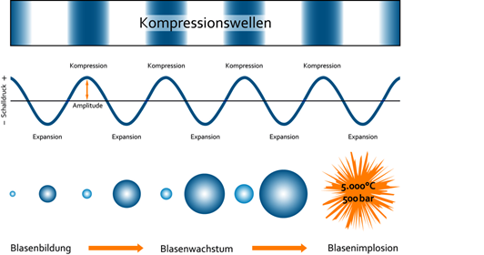 Die Dampfblasen fallen mit sehr hoher Geschwindigkeit zusammen, wodurch sich große Scherkräfte aufbauen, die das vorhandene feste Material sehr feinteilig zerlegen. Das trifft nicht nur Fasern des Substrats, sondern auch Bakterien, die dadurch ihren Zellinhalt ausschütten. Auf diese Weise geraten Enzyme in die Lösung, die den Aufschluss des Materials beschleunigen. Durch das Zerlegen der Fasern mittels Hochleistungsultraschall wird den lebenden Bakterien wegen der bedeutend vergrößerten Oberfläche des Substrats ein vielfach verbesserter Zugang ermöglicht.