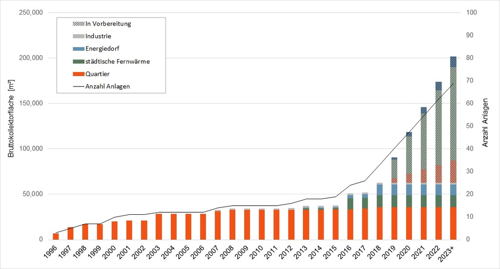 Für die kommenden fünf Jahre bis 2023 erwartet Dirk Mangold, Leiter des Steinbeis-Forschungsinstituts Solites, eine Verdopplung der Anlagenzahl auf 70 große Solarsysteme mit einer Verdreifachung der Leistung auf dann 140 MW. "Diese Zahl errechnet sich aus bereits laufenden Projekten und konkreten Machbarkeitsstudien, wobei wir die jeweilige Realisierungswahrscheinlichkeit als Faktor einkalkuliert haben", erläutert Mangold.
