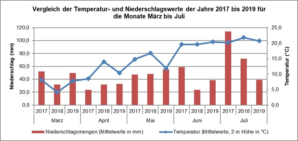 Der Versuch wurde in Bönnigheim bei guten Bedingungen am 29. März mit vorgekeimten Pflanzgut ausgepflanzt. Die Bestände liefen in der dritten Aprilwoche auf, Frostschäden traten nicht auf. Die Jugendentwicklung war zügig, was dazu führte, dass sich die Reihen bereits Ende Mai schlossen. Ausreichende Niederschläge im Mai und Juni sorgten für einen hohen Knollenansatz und ein starkes Krautwachstum. Ein Starkregen in der letzten Juniwoche setzte der Dammstruktur sehr zu, die Folge waren vielfach ergrünte Knollen. Der Schädlingsdruck durch Kartoffelkäfer und Drahtwürmer war hoch.