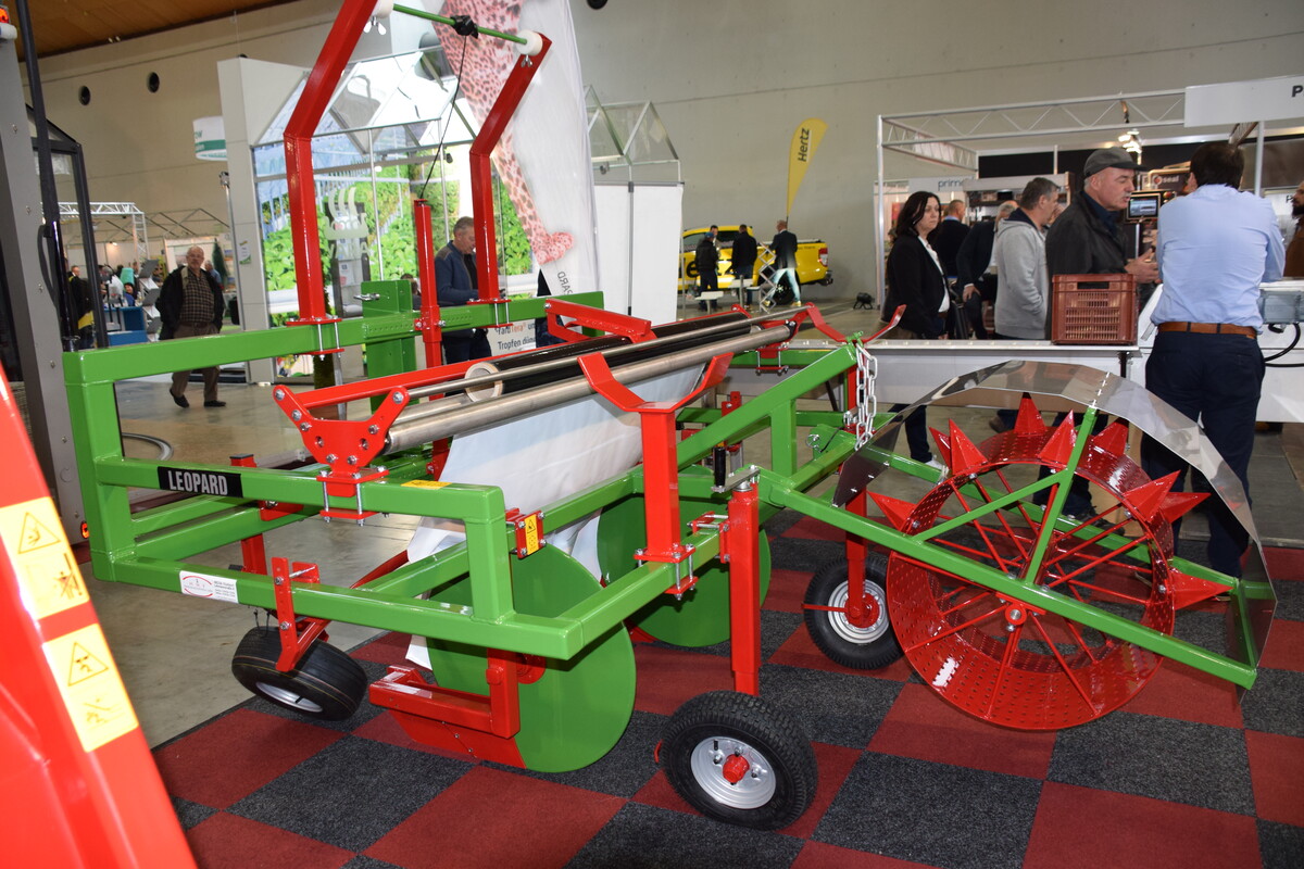 Die Firma Hermeler Maschinebau GmbH stellte ihre neue Scheibenegge TUKAN vor. Sie ist für den Anbau an den Schmalspurschlepper gedacht und eignet sich besonders für die Bodenbearbeitung zwischen den Spargelreihen. In Kombination mit einer Sämaschine kann zwischen den Reihen eine Zwischenbegrünung ausgesät werden. Die Scheiben und Walze des Bodenbearbeitungsgeräts lassen sich hydraulisch verstellen. Das Folienlegegerät LEOPARD ist ein praktischer Helfer im Erdbeeranbau. Mit dem Gerät können Anti-Tau-Folien, Schwarz- und Weißfolien mit oder ohne Sand gefüllt verlegt werden. Die Stärke der Folienspannung lässt sich individuell einstellen. Passend zum Gerät ist ein Lochstanzrad erhältlich, das parallel zum Verlegen der Folie Löcher stanzt, in die später die Erdbeeren gepflanzt werden.