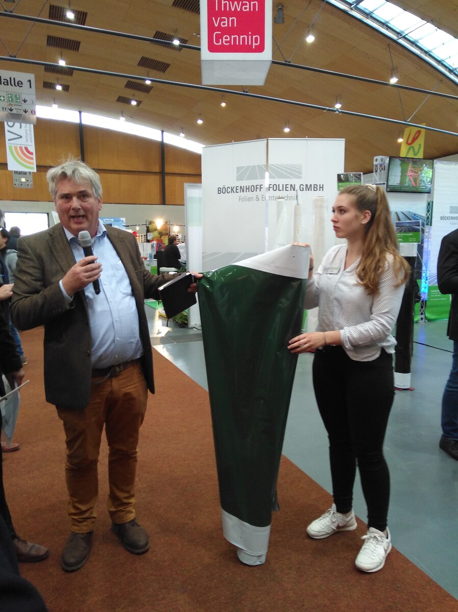 Neu ist beispielsweise auch die grün-weiße Spargelfolie von der Böckenhoff Folien GmbH. Die grüne Farbe absorbiert die Sonnenenergie genauso gut wie die schwarze, fügt sich allerdings besser in das Landschaftsbild ein. Die Firma entwickelte zudem ein System zum Folienrecycling. Mit welchem Konzept Böckenhoff es dem Kunden anbieten will, steht noch nicht endgültig fest.