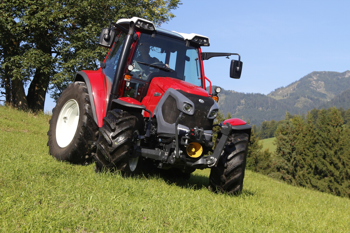 Die Lintrac LDrive-Modelle sind mit rumpf- oder achsgeführter Fronthydraulik erhältlich. Gerade im steilen und unwegsamen Gelände schätzen Grünlandprofis die EFH (Elektronische Fronthubwerksregelung) mit integrierter Geräteentlastung. Mit dem Drehregler in der Fahrerkabine können die Fahrer den Auflagedruck des Mähwerks stufenlos anpassen – und das bis zu einer Fahrgeschwindigkeit von 17 km/h. Ein Pluspunkt sei zudem die einfache Montage der Anbaugeräte, da keine mechanischen Entlastungsfedern am Traktor eingehängt werden müssen.