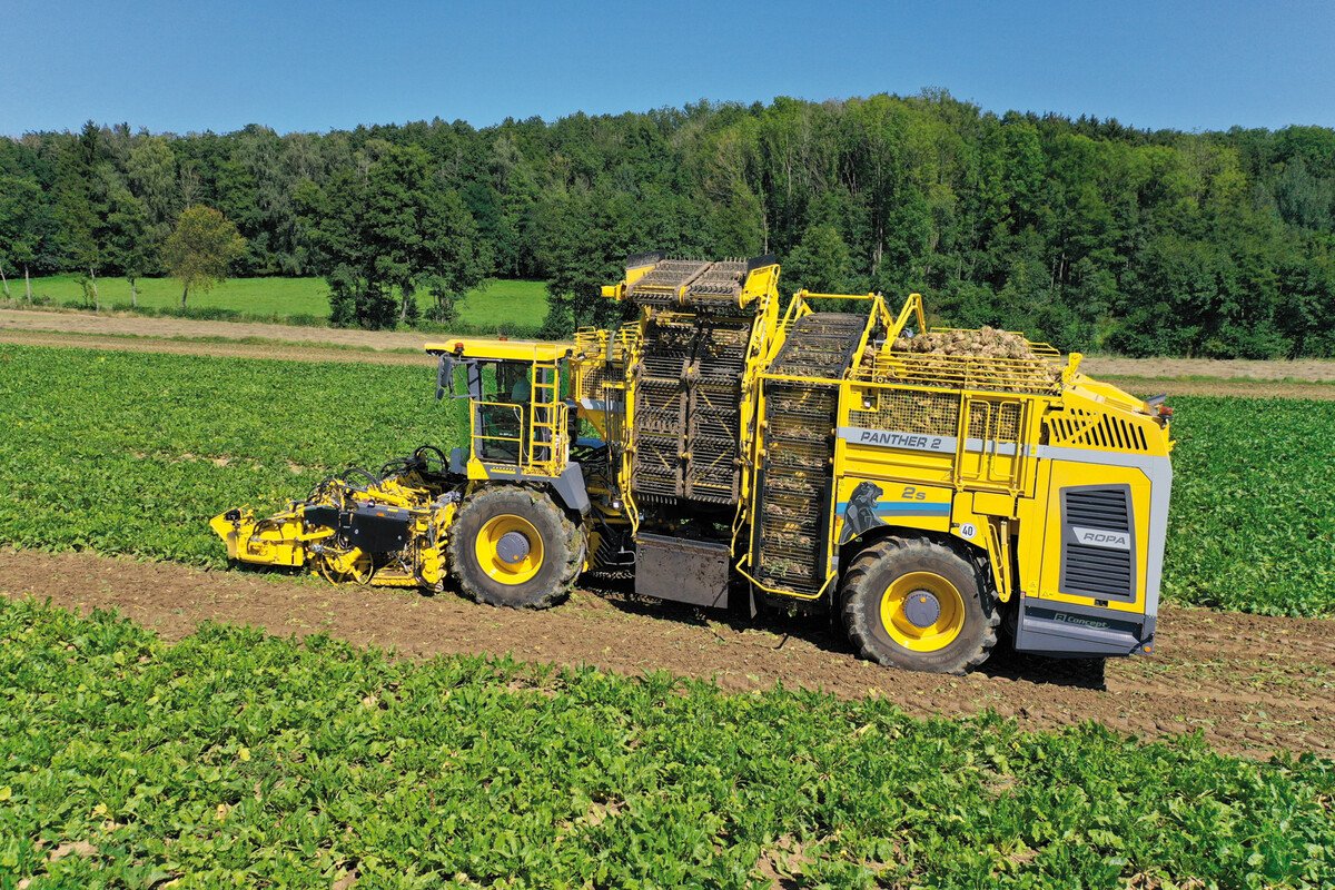 Einzigartig unter den zweiachsigen Rübenrodern sei der automatische Hangausgleich mittels vier Hydraulikzylindern und Sensorik. Das komplette Fahrzeug wird um jeweils bis zu sieben Prozent zum Hang geneigt und dadurch waagrecht gehalten. Das Rodeaggregat führt sich selbst durch Abtastung der Bodenoberfläche.