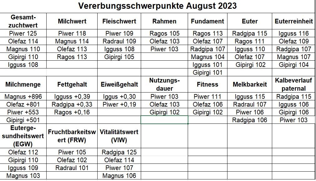Die Besamungsempfehlung für Vorder- und Hinterwälder aufgrund der Zuchtwertschätzung vom August 2023 hat das Landratsamt Schwarzwald-Baar-Kreis zusammengestellt.