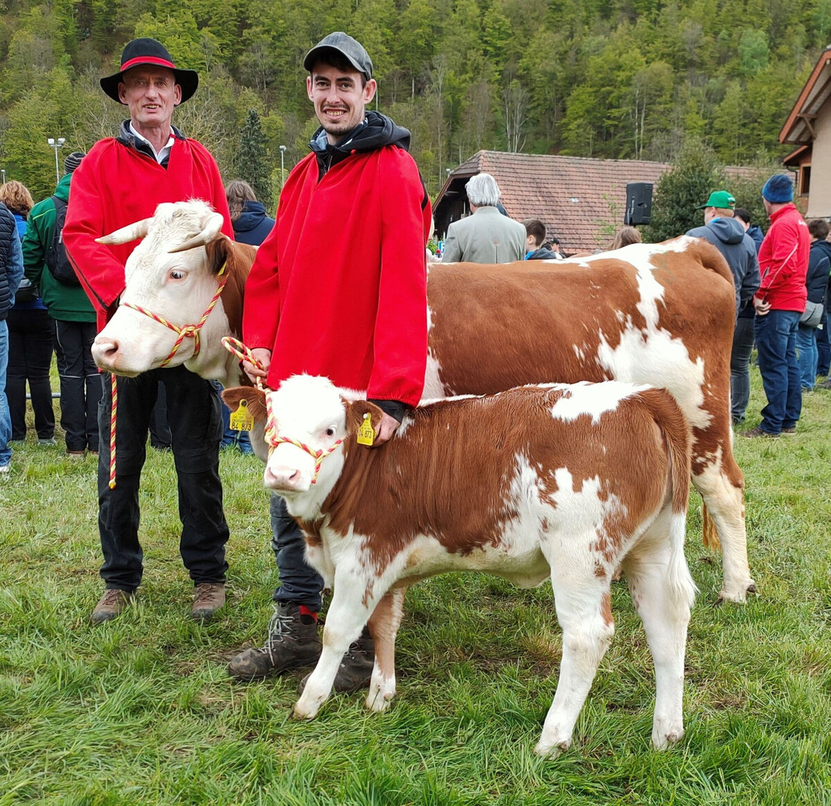 Nahtlos ging es weiter mit dem Richten der Mütterkühe mit ihren Kälbern. Bei den weiblichen Absetzern siegte Mutterkuh Alina mit einem Kuhkalb von „Walfock“ aus dem Stall von Ewald Kiefer, Fröhnd-Ittenschwand. Den Reservesieg errang die Gebrüder Matt GbR aus Aitern mit „Sterni“ und ihrem elften Kalb. Sterni war die älteste Mutterkuh und gewann auch den Titel „typvollste Mutterkuh“. Bei der männlichen Fraktion siegte Manfred Kuttler aus dem Kleinen Wiesental-Raich mit der Rouben-Tochter Laura. Sie hatte als fünftes Kalb ein Bullenkalb von „Sisifag“ dabei. Zweitplatziert war das Gespann Maja und ein Benforal-Bullenkalb, das Armin Roser aus Müllheim-Muggardt präsentierte. Bei den Mutterkühen wurden 14 erste und zwei zweite Staatspreise vergeben.