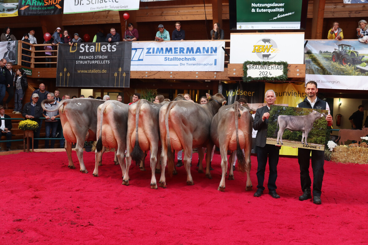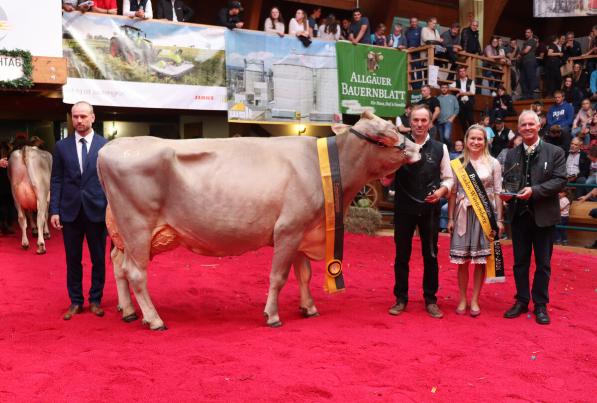 Zur Euterchampion-Wahl standen sieben Mehrkalbskühe im Ring. Das Rennen entschied am Ende Phil-Tochter Inora von der Sauter GbR, Bad Wurzach. Aus dem gleichen Betrieb stammt auch die Kuh Grand Champion 2024 des Waldseer Braunviehtages. Diesen Titel holte sich unter großem Beifall Calvino-Tochter Lawina.