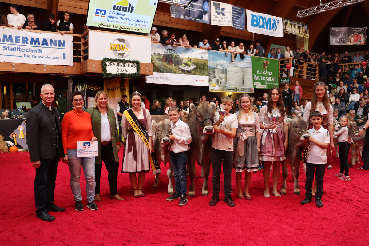 Die zum Beginn des Tages noch amtierende Braunviehkönigin Isabell Allmendinger richtete den Jungzüchterwettbewerb der Kinder im Alter von bis zu elf Jahren. Julian Hörmann, Kirchdorf-Oberopfingen, eröffnete als jüngster Teilnehmer den Wettbewerb. Die Jungzüchter präsentierten ihre Tiere nicht nur hervorragend, sondern wussten in der Befragung viele Details über Fütterung und Haltung der vorgestellten Kälber. Johannes Beigger, Bodnegg, zeigte eine perfekte Vorführhaltung und siegte am Ende vor Rafael Denzel, Eberhardzell.