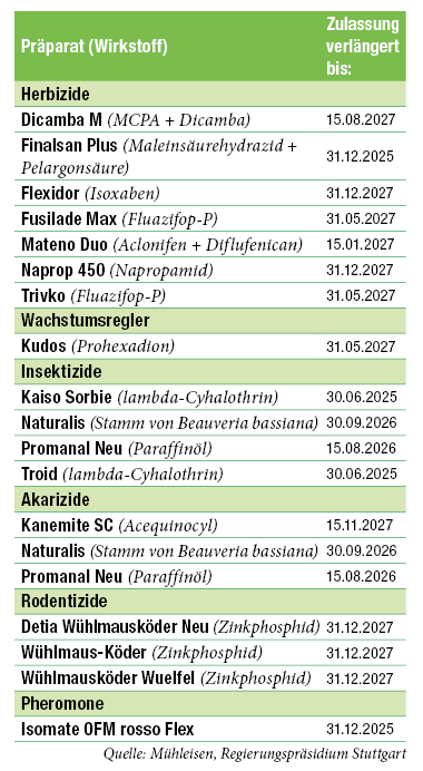 Das Bundesamt für Verbraucherschutz und Lebensmittelsicherheit hat die Zulassung von Pflanzenschutzmitteln, deren Zulassung durch Zeitablauf endete, verlängert. Diese Zulassungsverlängerungen werden bis zur endgültigen Entscheidung über eine erneute Zulassung erteilt (siehe Tabelle).