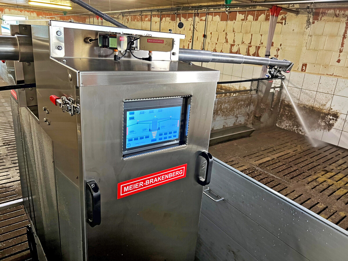 Der Waschroboter Cleansman von Meier-Brakenberg reinigt mit zwei zeitgleich arbeitenden Düsen, die einen 360-Grad-Reinigungsradius bieten. Auf diese Weise reinigen sie die Bodenfläche einmal in parallelen Bahnen quer zum Gang und einmal längs zum Gang. So soll eine vollständige Abdeckung ohne Schattenbildung erreicht werden. Die Spalten und Wände werden mit voller Wasser- und Druckleistung gewaschen, heißt es vom Hersteller. Der integrierte frequenzgeregelte Hochdruckreiniger sorgt für unterschiedliche Arbeitsdrücke, sodass auch die Decke gereinigt werden kann. Eine Druck- und Wasseranpassung ist möglich. So wird auch ein Einweichen und Nachreinigen ermöglicht. Die integrierte Hochdruckpumpe liefert 70 Liter Wasser pro Stunde, während zwei automatisch ein- und ausfahrende Teleskopausleger Hindernisse umfahren. Der neue Waschroboter soll in zwei Jahren erhältlich sein.