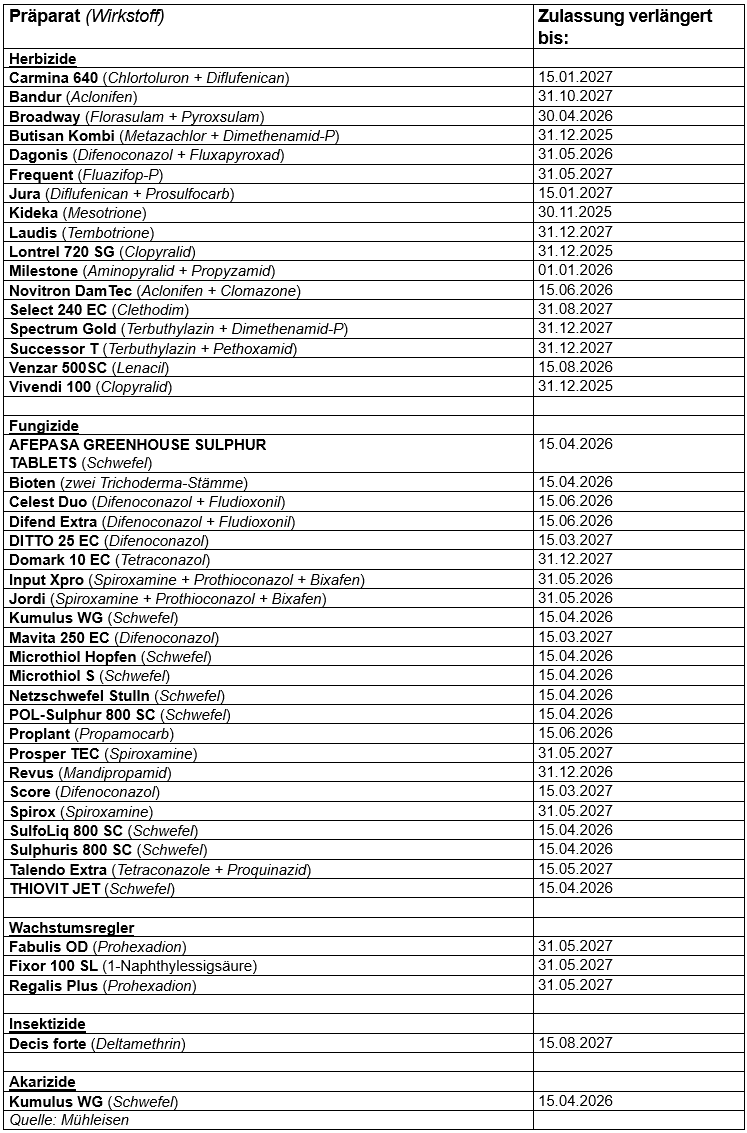 Das Bundesamt für Verbraucherschutz und Lebensmittelsicherheit hat die Zulassung von Pflanzenschutzmitteln, deren Zulassung durch Zeitablauf endete, verlängert. Die Zulassungsverlängerungen werden bis zur endgültigen Entscheidung über eine erneute Zulassung erteilt.