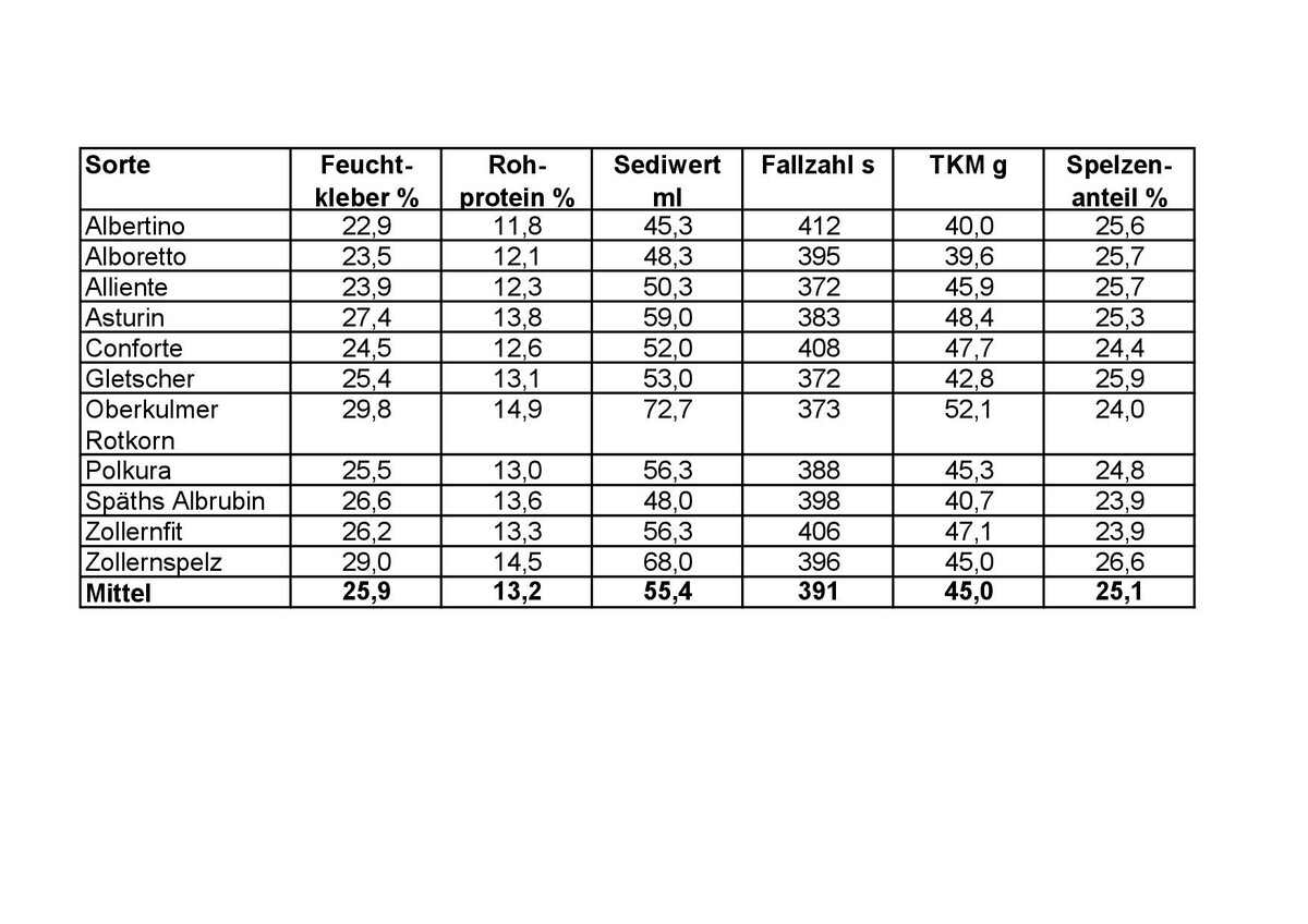 Der Durchschnittsertrag über alle Standorte lag 2024 bei 36,4 dt/ha und somit deutlich (28 %) unter den Erträgen des Vorjahres. Bei den Qualitäten, insbesondere Feuchtkleber (25,9 %) und Rohprotein (13,2 %), schnitten die Sorten 2024 besser ab als im Vorjahr.