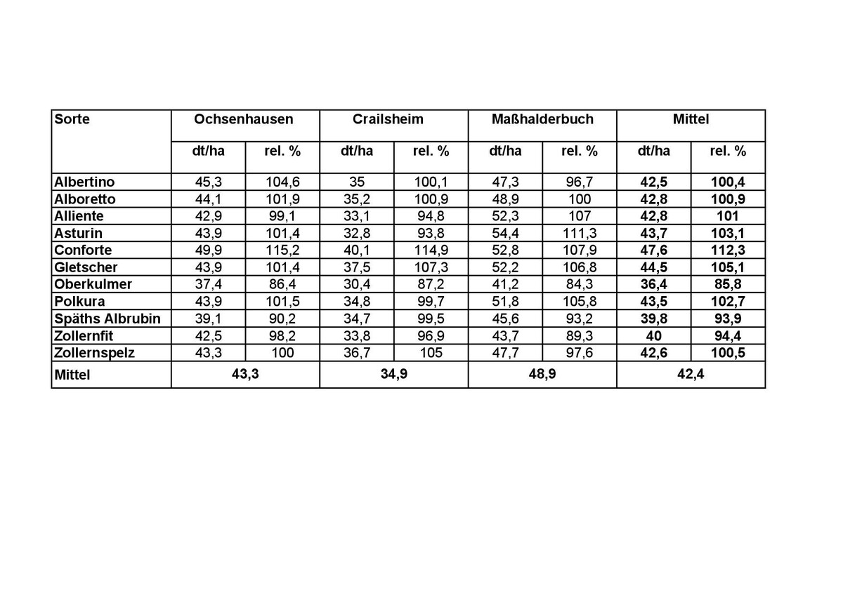 Standorten statt. Diese sind in Karlsruhe-Grötzingen (Betreuung durch LTZ Augustenberg), Stuttgart-Hohenheim (Betreuung durch Uni Hohenheim), Crailsheim (Betreuung durch Demeter-Beratung), Maßhalderbuch (Betreuung durch LRA Reutlingen und Uni Hohenheim) und in Ochsenhausen (Betreuung durch LRA Biberach). Die Standorte Hohenheim und Karlsruhe-Grötzingen waren in diesem Jahr nicht auswertbar. An allen Standorten wurden insgesamt 11 Sorten geprüft, von denen drei neu in die Prüfung aufgenommen wurden.