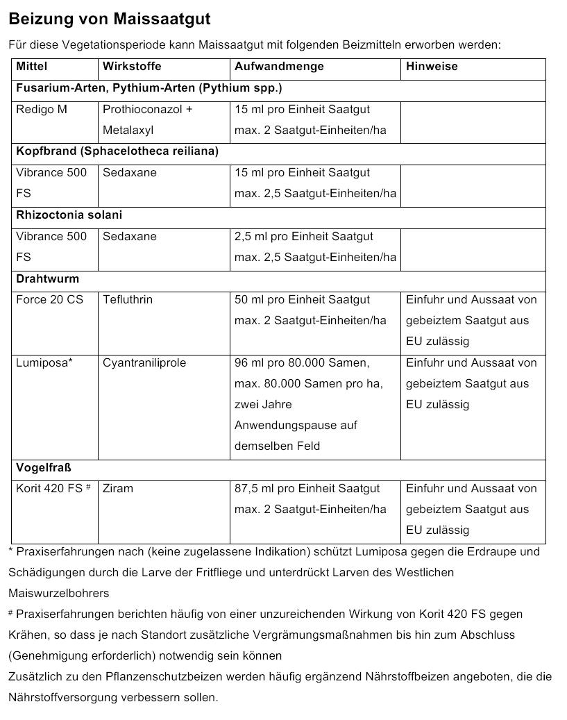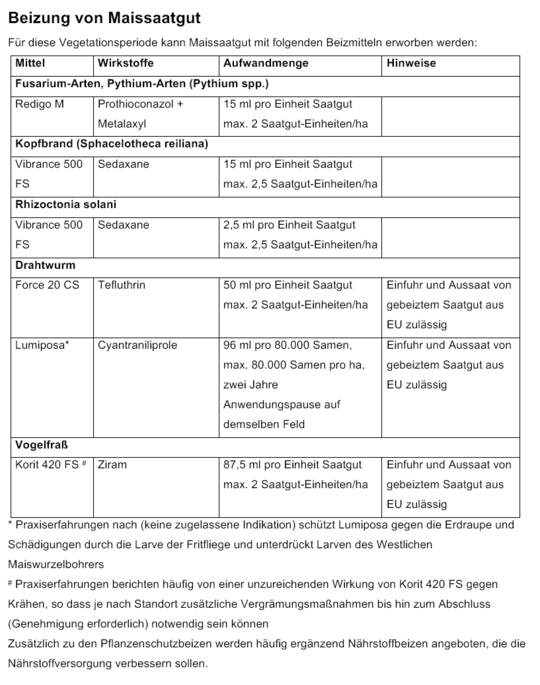 Für diese Vegetationsperiode kann Maissaatgut mit folgenden Beizmitteln erworben werden: