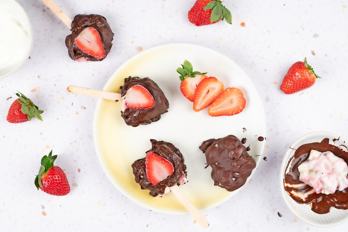 500 g süße Erdbeeren, 20 g weiße Schokolade, 160 g Joghurt (10 % Fett), 1 EL Agavensirup, 1 TL abgeriebene Zitronenschale, 100 g dunkle Schokolade, 1 1/2 TL gehackte Pistazien, 8 Eisstiele