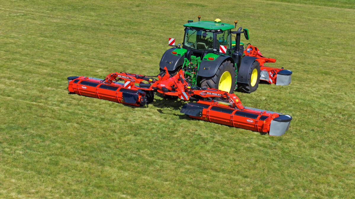 Mit dem neuen GMD 9530 RV erweitert Kuhn das Produktprogramm der Großflächenmähwerke mit Schwad-Zusammenführung. Das Scheibenmähwerk mit integrierter Querförderschnecke mäht und führt das Futter ohne weitere Aufbereitung im selben Arbeitsgang auf ein zentrales Schwad zusammen.