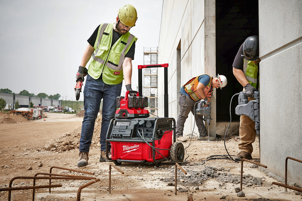 Der mobile Generator Irpsuop2500 von Milwaukee hat einen fest verbauten 2,5-Kilowattstunden-Akku mit einer Spitzenleistung von 7,2 Kilowatt und einer Dauerleistung von 3,6 Kilowatt. Drei Netzsteckdosen erlauben den gleichzeitigen Betrieb mehrerer Netzgeräte oder den Anschluss von Ladegeräten, um Werkzeugakkus direkt auf der Baustelle aufladen zu können. Um auch mobile Endgeräte zu laden, gibt es einen USB-C- und einen USB-A-Anschluss.