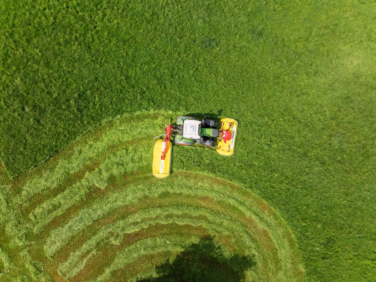 In Kurvenfahrten und in Hanglagen sorge der Seitenverschub für die Überlappung zum Heckmähwerk sowie die Fahrt in futterfreier Spur. Mit der bogenförmigen Ausführung wird die gesamte Arbeitsbreite des Mähbalkens genutzt und die Arbeitsbreite der Mähkombination maximiert, heißt es von Pöttinger. Systeme mit geradlinigem Verschub hingegen würden in dieser Situation einige Zentimeter liegen lassen. Ein besonderer Vorteil dieser Technik sei die Möglichkeit, automatisiert auf sich ändernde Überlappungsgrade zwischen Frontmähwerk und Traktor oder Heckmähwerk(en) zu reagieren.