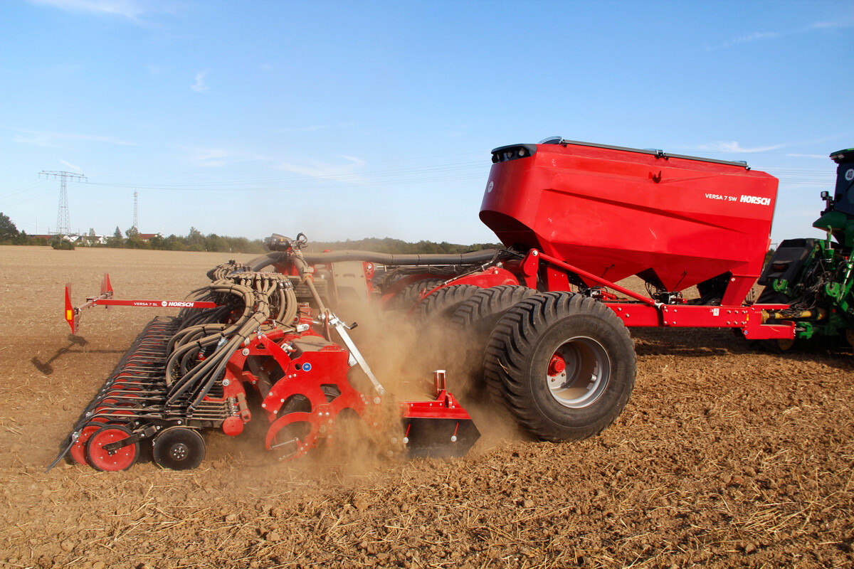 Die neue Versa 7 SW von Horsch erweitert das Kreiseleggensegment mit einer Arbeitsbreite von 7,20 Metern. Nicht nur die Arbeitsbreite in der Versa SW Familie ist gestiegen, sondern auch das Tankvolumen. So wird die Versa 7 SW mit einem 6300 Liter Doppeltank ausgestattet. Neu ist auch das Grundkonzept des Säwagens. Es handelt sich um einen eigenständigen Maschinenverbund aus Säwagen und Kreiselegge. Diese wurden jeweils mit einem eigenen Fahrwerk ausgestattet. Dadurch entfällt das hydraulische Verfahren des Reifenpackers unter die Kreiselegge.