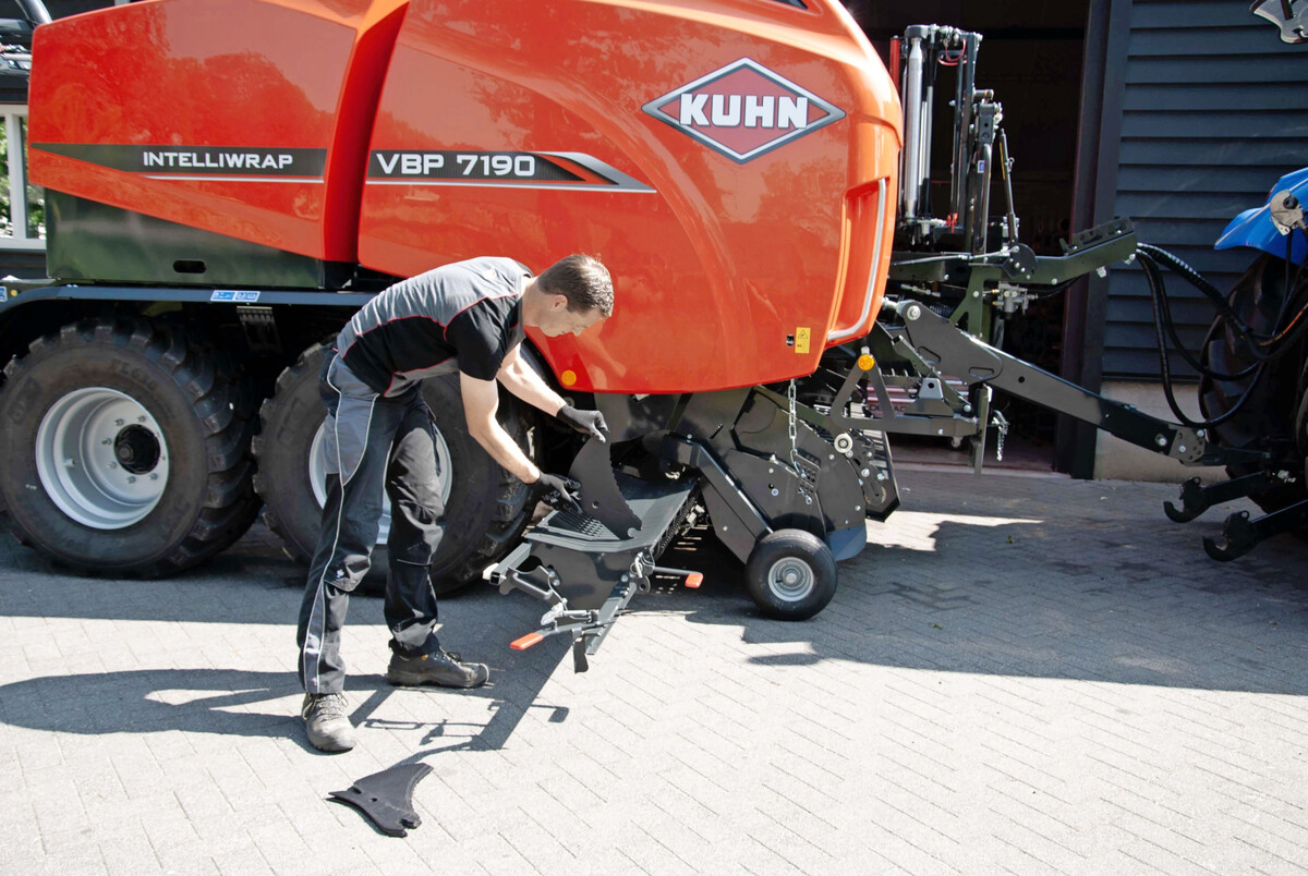 Jedes einzelne der 33 Messer werde richtig positioniert und die proaktive Messerreinigung säubere nach einer festgelegten Anzahl Ballen alle Messer – auch die ausgeschwenkten Messer. Dadurch können sich die Messer nicht verklemmen und lassen sich werkzeuglos einfach entnehmen und wechseln, verspricht Kuhn. Bei Überlast kann jedes Messer einzeln ausschwenken. Die Messerkassette lässt sich ohne Werkzeug herausziehen.
