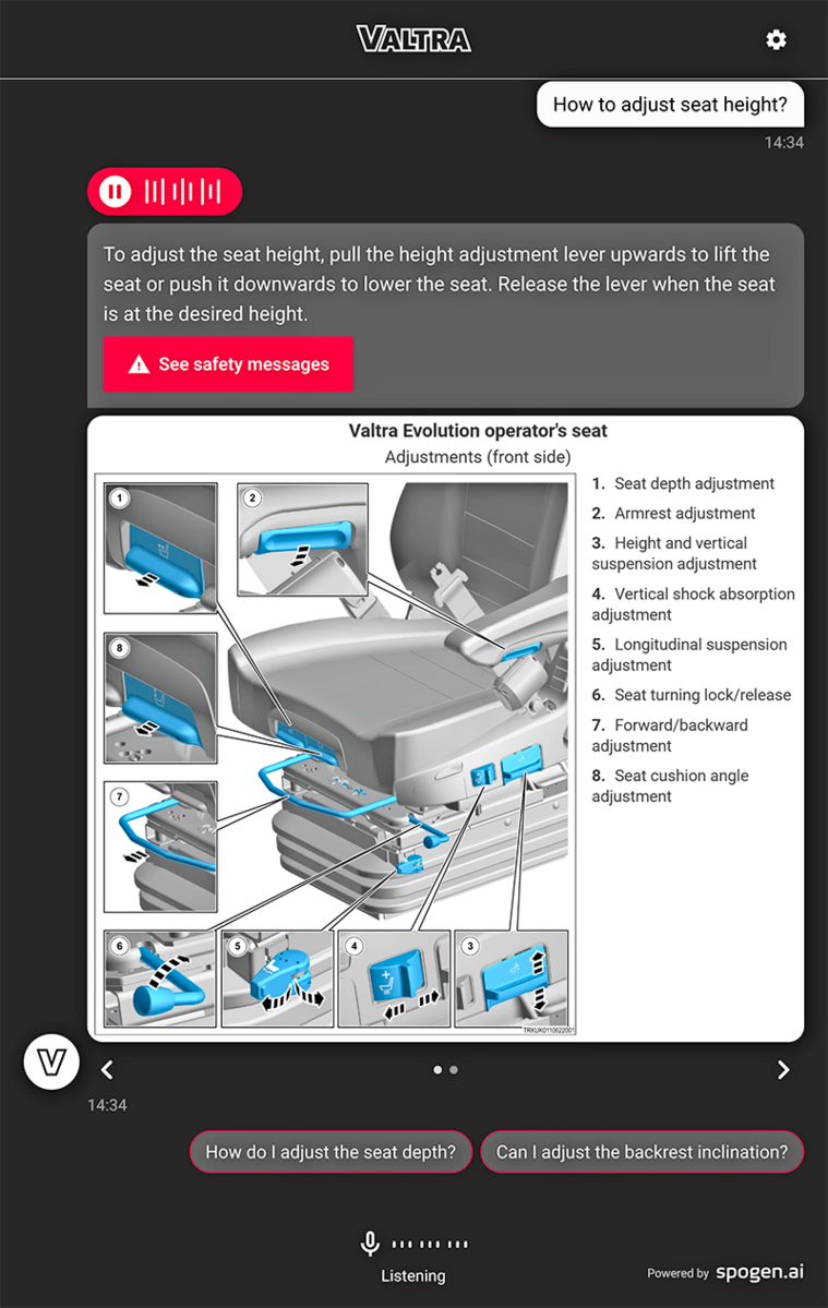 Die Valtra Q-Serie präsentiert das Talking Tractor-Konzept von Valtra Coach. Bei dieser Valtra Coach-Anwendung handelt es sich um einen sprach- und textgestützten Assistenten, der die Landwirtschaft einfacher, intuitiver und datengesteuerter machen soll. Das Konzept läuft auf einem mobilen Gerät und versteht und reagiert auf Englisch, Deutsch, Französisch und Finnisch und ist mit der gesamten Palette der Valtra Bedienungsanleitungen, intelligenten Landwirtschaftshandbüchern, Telemetriedaten und Arbeitssitzungsprotokollen geschult. Es unterstützt sowohl Sprach- als auch Textansagen und liefert Antworten über eine visuelle Schnittstelle, die für Tablets und mobile Geräte optimiert ist. Es wurden keine Veröffentlichungstermine oder Preise bekanntgegeben.