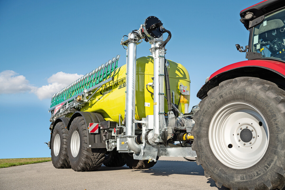 Fliegl Agrartechnik erweitert sein Pumpfass-Portfolio um das PFW Big Foot Poly Line 18.500 mit GFK-Tank. Der niedrige Schwerpunkt des Poly-Line-Fasses biete vor allem beim Einsatz in Hanglagen besondere Vorteile. Ein Merkmal sei auch die bodenschonende Bereifung 800/65 R 32. Das luftgefederte Fahrwerk sorge für Fahrkomfort auf der Straße. Optional sind zudem eine Reifendruckregelanlage und die elektronische Zwangslenkung Steer X erhältlich. Der doppelgelenkte Acht-Zoll-Saugrüssel Elefant erreicht eine Saugtiefe von mindestens 3,5 Metern und wird über einen proportionalen Joystick gesteuert, heißt es von Fliegl. Für eine hohe Förderleistung sorge die mechanisch angetriebene Vogelsang-Drehkolbenpumpe, unterstützt durch den Turbobefüller Pro Fill von Agrar Pro. Optional stehen die Isobus-Steuerung Fliegl Slurry Tanker sowie die Durchflussmengenregelung DMR zur Verfügung. Das Fass kann mit einer Vierpunkthydraulik ausgestattet werden, um zusätzliche Anbaugeräte, wie etwa eine Güllescheibenegge, anzukoppeln.