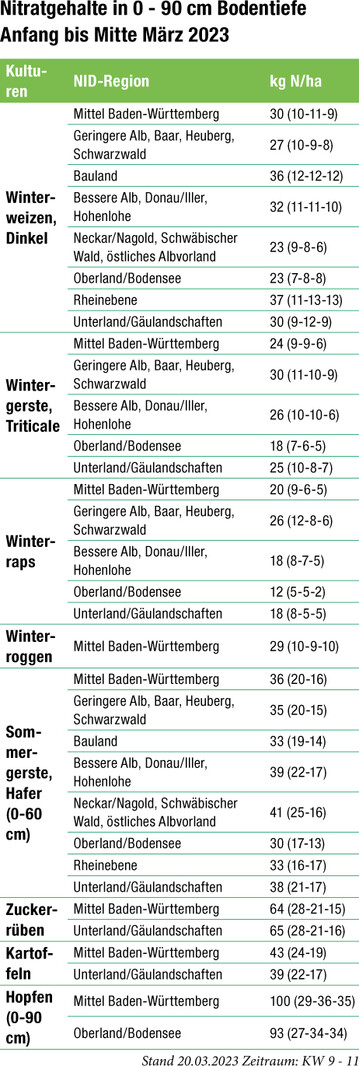 Seit dem 15. März können Mais und Reben über den NID beprobt werden. Kommende Woche kommen erste Ergebnisse. Der landesweite Mittelwert von rund 2300 Standorten für den Nitrat-N-Gehalt beträgt 37 kg N je ha und liegt 6 kg N je ha höher als in der Vorwoche.