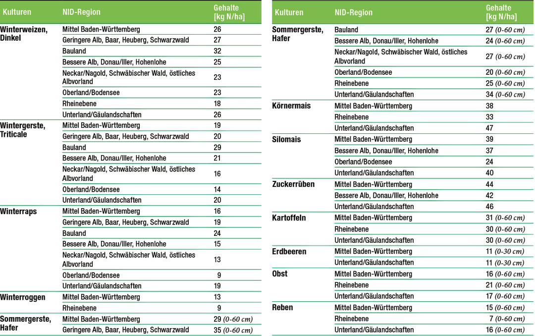 Der Probenahmezeitraum für Mais und Reben hat am 15. März 2018 begonnen. Diese Woche liegen für die Kulturen erstmals genügend beprobte Standorte vor, um Referenzwerte bilden zu können. Durch den erneuten Kälteeinbruch und der damit einhergehenden, geringeren Mineralisation in KW 12 sind die Nitratgehalte vergleichbar mit denen der Vorwoche. Der landesweite Mittelwert aus inzwischen 4300 Proben beträgt für den Nitratgehalt 27 kg N/ha. Die Verteilung über die einzelnen Schichten war: 12 - 9 - 6 kg N/ha. Damit sind der Gehalt und die Verteilung der Werte vergleichbar mit denen der Vorwoche. Für die Winterungen, die auch zu diesem Zeitpunkt noch 2/3 der NID-Proben ausmachen, lagen die Werte bei einer Bodentiefe von 0 bis 90 cm bei 23 kg...