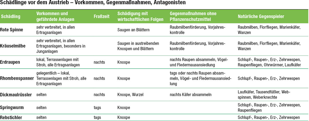 Im April beginnt mit der Bodenerwärmung das Wachstum der Reben und der Begrünungen. Neben den Arbeiten am Boden mit Einsaaten und Düngung, den Arbeiten im Büro mit dem gemeinsamen Antrag und den Vorbereitungen für die Saison, stehen Nachpflanzarbeiten in den bestehenden Anlagen und die Pflanzung von Neuanlagen an. Außerdem steigt nun die Gefahr von Schäden durch Austriebsschädlinge.