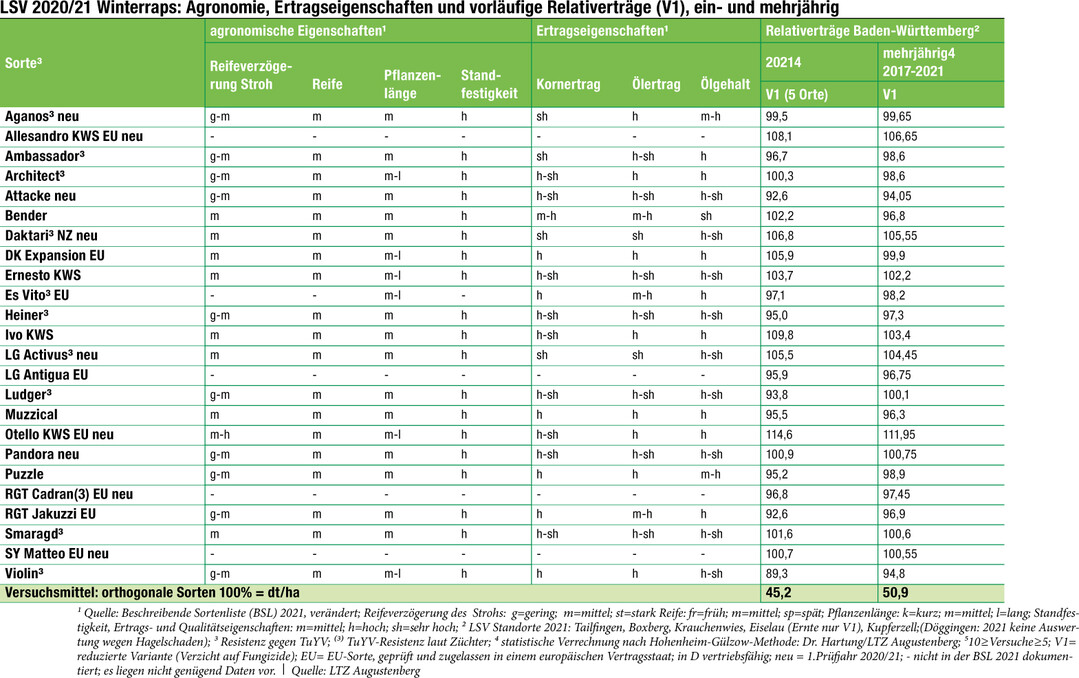 Kaum ist die Winterrapsernte eingefahren, muss man sich bereits entscheiden, mit welcher Rapssorte man in die nächste Saison starten will. Für 2021/22 steht wieder eine Vielzahl von Sorten zur Wahl, darunter auch erstmals in den LSV getestete. Am LTZ Augustenberg liegen nun die ersten Ergebnisse vor.