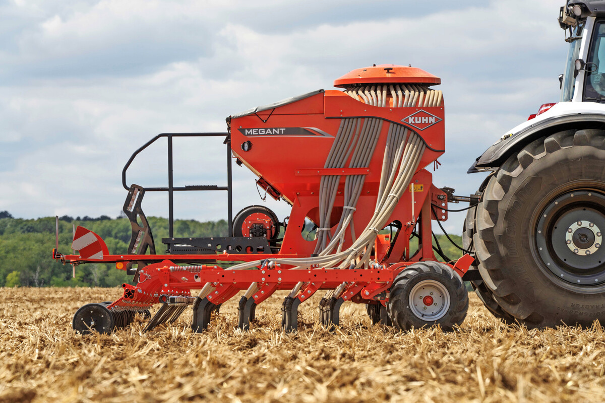 Das Programm der angebauten Zinkensämaschinen von Kuhn umfasst nun zusätzlich die Modelle Megant 722 R (7,20 Meter Arbeitsbreite) und Megant 802 R (acht Meter Arbeitsbreite). Die Modelle sind mit einem Saatgutbehälter von 1800 Litern ausgestattet. Besonders in feuchten, schweren und steinigen Böden oder bei vielen Pflanzen- und Ernteresten sei ein guter Durchgang durch die vierreihige Anordnung der Zinken gewährleistet. Für die Megant-Baureihe sind drei verschiedene Säzinken verfügbar. Auf Griff stehende Säzinken, die beidseitig verwendet werden können, gerade Säzinken, besonders für steinige Böden geeignet und ein schmaler Säzinken mit zwölf Millimeter Breite für wenig Erdbewegung in der Saatfurche.