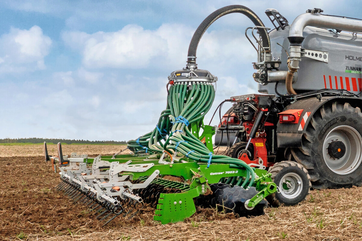 Ab sofort wird die Kompaktscheibenegge Catros pro serienmäßig ab Werk mit dem SynCult-Vogelsang-Gülleverteiler DosiMat DMX zur Ausbringung von Gülle angeboten. Die Ausbringmenge beträgt bis zu 10.000 Liter pro Minute. Die Einarbeitung übernimmt eine 510 Millimeter große, grob gezackte Scheibe, die Arbeitstiefen von fünf bis 14 Zentimeter ermöglicht. Das Smart Frame System gewährleistet die vollhydraulische Einstellung der Arbeitstiefe aus der Kabine.
